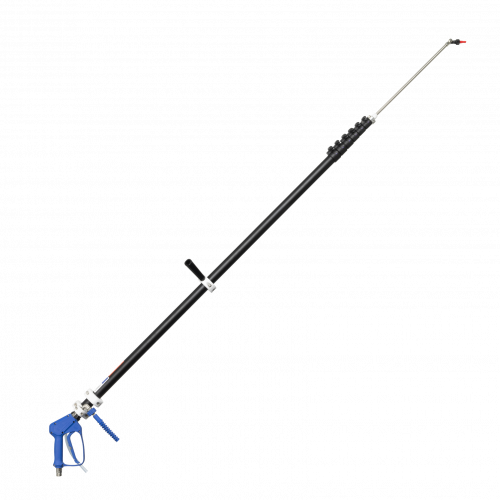 HERMES Chemie-Teleskoplanze aus Carbon zum Auftragen von Reinigungsmitteln und Bioziden auf die Fassade. Düsenkopf um 180° drehbar mit Venturi-Düse sowie chemiebeständigem Ventil und Dichtsatz. Inklusive drehgelagerter Chemiepistole (bis max. 50 bar) und individuell einstellbarem Handgriff für einfaches und leichtes Arbeiten auf der Baustelle. Geprüft und geeignet für alle gängigen HERMES Reinigungsmittel.