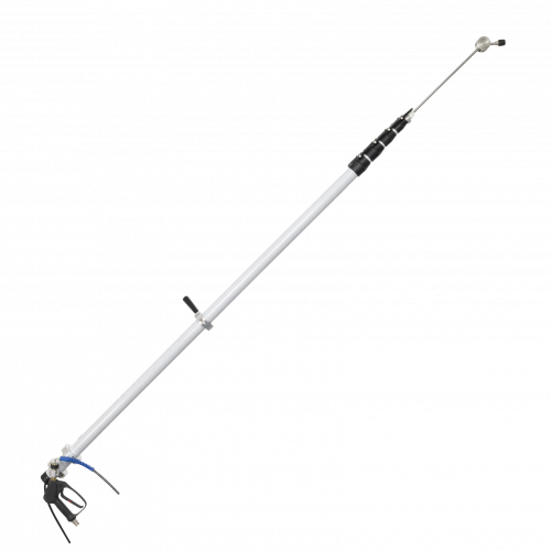 HERMES Hochdruck-Teleskoplanze aus robustem Fiberglass mit 25° Flachstrahldüse zum Abspülen der Fassade. PowerGrip-Verschlüsse verhindern das Verdrehen einzelner Profile. Durch das integrierte Drehgelenk lässt sich der Düsenkopf um 180° drehen. Inklusive drehgelagerter Hochdruckpistole (bis max. 350 bar) und individuell einstellbarem Handgriff. Durch die integrierte Ringöse kann die Hochdruck-Teleskoplanze ohne großen Aufwand am HERMES Lanzengurt befestigt werden. Dies ermöglicht ein einfaches und leichtes Arbeiten auf der Baustelle.